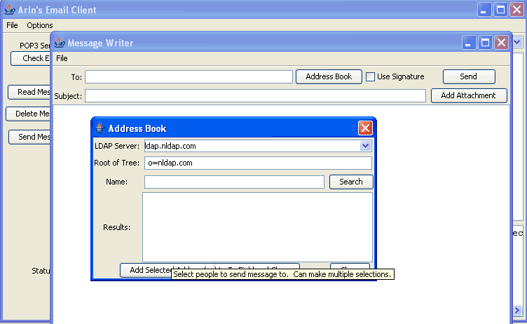 Using this window, A user can look up an email address in any LDAP server and add it automatically to the To: field of the outgoing message. |