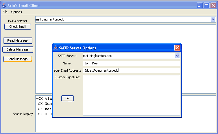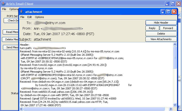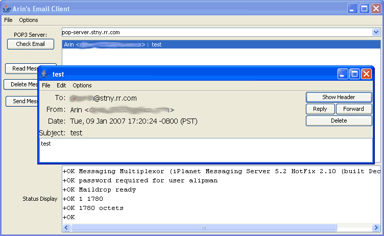 A message viewer is displayed with the options to display full headers, delete, reply and forward. HTML is automatically parsed and displayed. Also viewable is the status display of the main window, which gives all server responses. |
